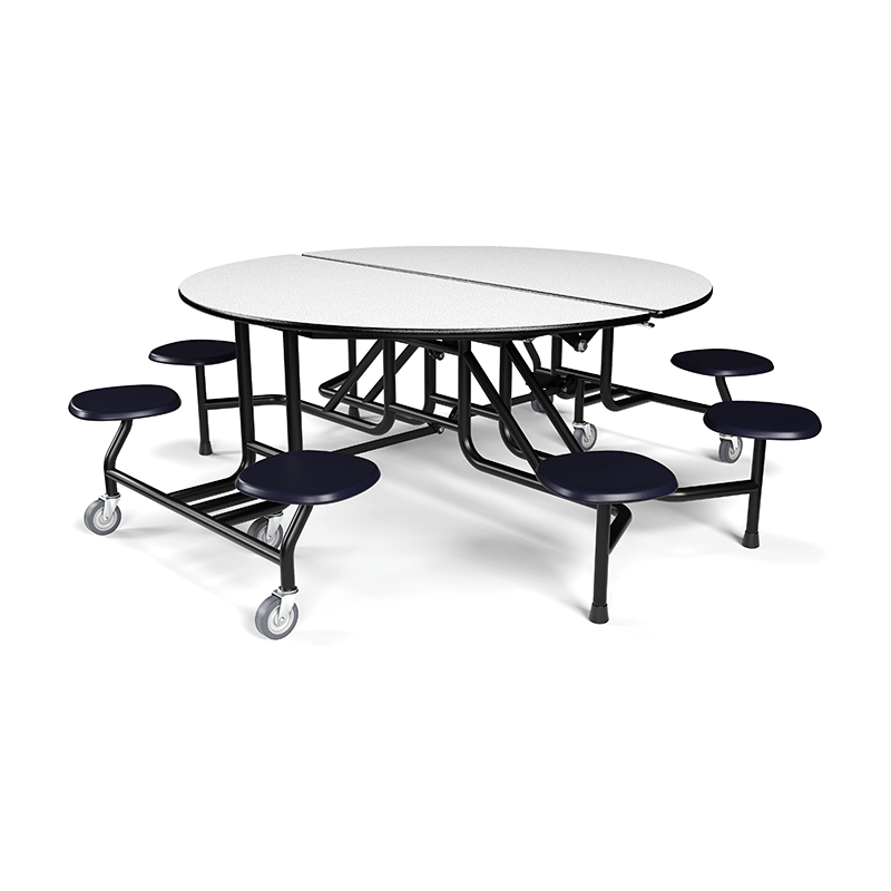 The 60" Round Folding Lunchroom Table with Stool Seats is engineered for high-use dining environments that demand durability, efficiency, and space savings. Featuring a heavy-duty steel frame and a smooth torsion-bar lift-assist folding system, the table opens and closes with minimal effort for daily operation. Eight permanently attached stool seats remain evenly spaced for organized seating, while the moisture-resistant edge protects against spills and impact. Integrated casters allow the entire unit to roll easily for quick room reconfiguration and compact storage. Ideal for schools, student centers, and corporate dining facilities, this folding lunchroom table delivers reliable performance in fast-paced commercial settings.