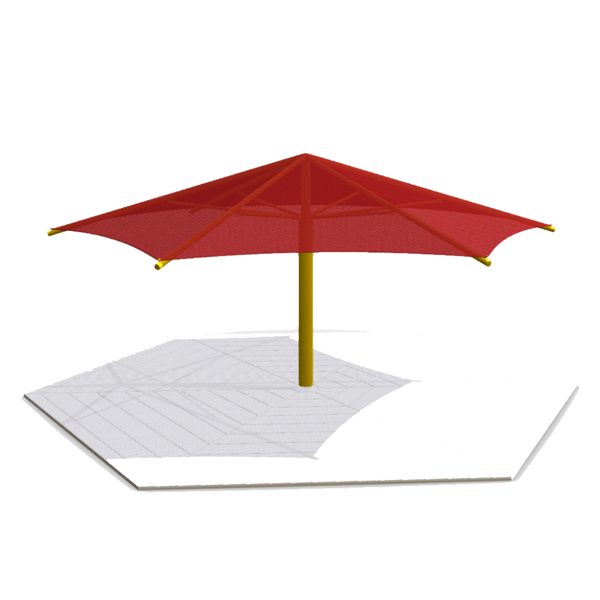 This Hexagonal Shade with a single post is an ideal choice for parks, playgrounds, and daycare facilities as it perfectly covers tables, benches, and small playsets. The umbrella-style frame is made with powder-coated steel and features a glide elbow canopy attachment on all six ends. Glide elbow allows the canopy to be removed during storms with higher than 93 MPH wind rating to prevent damage to the fabric. The canopy is made with commercial-grade fabric designed to repel water, resist mildew, and prevent fading from sun exposure. Choose from a range of shade sizes starting at 10' up to 27' in diameter. Entry height of 8' means tables and benches have plenty of headroom. This listing is for surface mounted but we offer inground mounting as well.