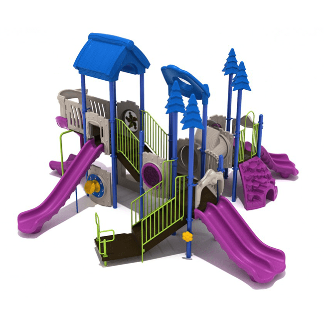 The Banana Bonanza play structure offers a plethora of activities and amusement for children. It features six fantastic slides, including the 76-inch Spiral Slide and two Double Slides for friendly competitions. Children can access the slides by climbing the rugged Rock Hole Climber or the simple Transfer Station. A Tube Bridge with Window and a creatively designed log bridge connect the two elevated areas, giving children the feeling of navigating through treetops effortlessly. On the ground level, a Stump Store Panel, Drum Panel, Bench Panel, Rain Wheel, and Ship's Wheel await to kickstart the fun. The excitement continues on the upper levels with a Gear Panel, Plinko Panel, and Ball Maze Panel. The Banana Bonanza play structure is brimming with activities, and the more children explore, the more fun they will discover.