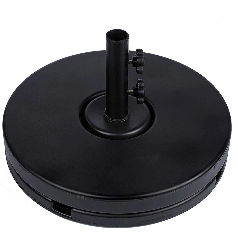 This 80 lb. resin-coated plastic umbrella base is concrete filled for sturdiness. Featuring a removable double ring design, this base is easily movable. This umbrella base is recommended for under a table usage and requires a 14.5″ height sleeve to hold the umbrella pole. This base fits umbrellas up to 1.5" in diameter. Umbrellas are securely held in place with the two included tightening knobs. Available in black, bronze, and white.