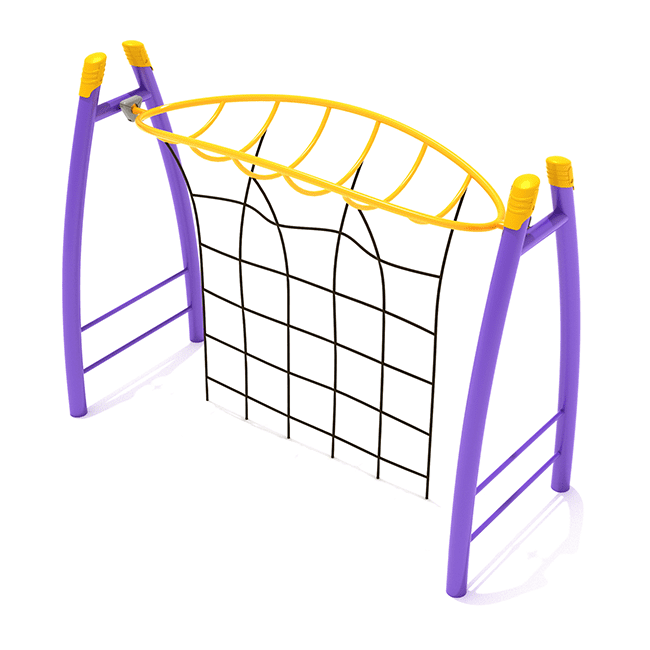 The Curved Post Overhead Inverted Horizon Climber with Rope Attachment is a sturdy and visually appealing piece of fitness equipment that offers the traditional activity of rope climbing. Constructed from durable steel and coated with weather-resistant paint, this climber is captivating to behold. It provides a challenging workout as children use their core, arms, and legs to scale the vertical netting. This not only promotes gross motor skill development but also improves their ability to perform daily physical tasks such as running, jumping, standing, and walking. The climber is conveniently low enough for children to successfully reach the top, creating a sense of accomplishment and thrill. The rope grid is composed of sturdy steel covered with tamper-resistant nylon, ensuring that enthusiastic climbers do not swing the net or themselves into the surrounding frame.