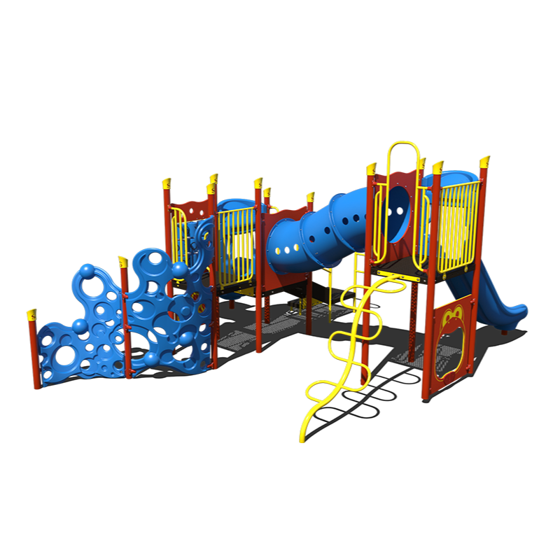 Hopper's Burrow Play Structure is designed for children ages 5-12 years old. This outdoor playset is perfect for elementary schools because children will burn off energy while developing growing muscles. They can explore the crawl tunnel to get to the high slide and reach new levels from the climbing walls. Constructed with a powder-coated steel frame and polyethylene panels ensuring a durable structure that will last for years to come. Add play value to any schoolyard or apartment complex with Hopper's Burrow Play Structure. The color theme shown is available for quick ship, for more options call our friendly staff and get a quote.
