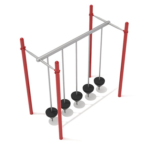 The Single Row Pebble Bridge is an exciting playground obstacle that will put children's balance and agility to the test. This unique structure consists of five pebble pendulum platforms that hang from an overhead bar. As children make their way across, they must navigate the wobbly steps, which have large and slip-resistant surfaces. These steps are designed to shift and swing with each step, adding an element of unpredictability to the challenge. Despite their free-swinging setup, the platforms are connected to the ground by small chains, preventing them from swinging too far. The circular design of the platforms allows children to step on any part of them, making it easy to use from either direction. Moreover, the vertical bar that runs through the platforms serves as a helpful grip for maintaining balance. Overall, the Single Row Pebble Bridge provides an exhilarating and interactive experience for children on the playground.