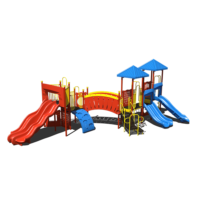 The Slide Cross Commercial Grade Playground Equipment is the perfect addition to any HOA, school, or park. This playground features a variety of fun and educational components, such as a store front panel where kids can imagine being shop owners, an alphabet panel for learning letters, a bubble panel for sensory play, a crawl thru panel for physical development, and a driving panel for imaginative play. But that's not all - this equipment also has multiple climbing options, including the bedrock climber, cargo net climber, clover climber, and coil climber, to help children build strength and coordination. And once they reach the top, they can choose from three different slides - the alpine thunder slide for an adrenaline rush, the straight double slide for a classic experience, or the left turn slide for a little twist. Safety is also a top priority, with a fall height of 6 feet and a user capacity of 44. And for some sun relief, there are two hard top square shingle roofs and an arch bridge for added fun. This playground is designed for children aged 2 to 12, making it a perfect fit for a wide range of ages and abilities. Children will have a blast playing on this Slide Cross Playground while also developing important skills.