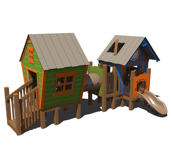 The Tiny Tots Town Playground Set is an eco-friendly playground equipment made entirely of plastics and recycle plastics. This playful structure includes two charming cottages connected by a crawl tunnel and equipped with slides, climbers, and interactive panels for the little ones aged 2-5 to enjoy. With a size of 22' x 16', this play set can accommodate 10-15 children and boasts a use zone of 35' x 28', making it perfect for small outdoor spaces. Rest assured, this structure comes with a fall height of only 4' and 27 recycled timber pieces, ensuring a safe and environmentally-responsible play time. ADA compliant.
