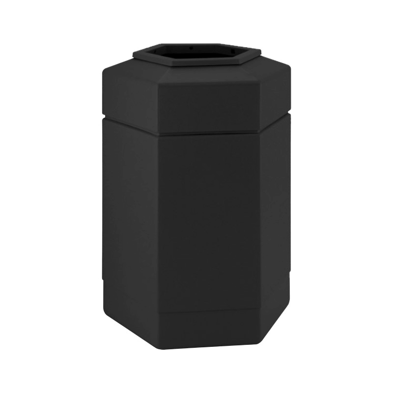 The 30-gallon hexagon trash receptacle crafted from 1/8" thick polyethylene plastic to withstand the harshest weather conditions. The unique hexagonal shape grants a modern look perfect for shopping malls, universities, office buildings, and state parks. The easy lift-off lid allows quick access to trash bags, kept secure by a patented grab bag system. The interior and exterior of the can be easily cleaned with a standard degreaser. and is made of at least 25% post-consumer recycled materials. Choose your choice of color available in black, beige, and gray. This heavy-duty trash can is proudly manufactured in the USA provided with a 1-year commercial warranty.