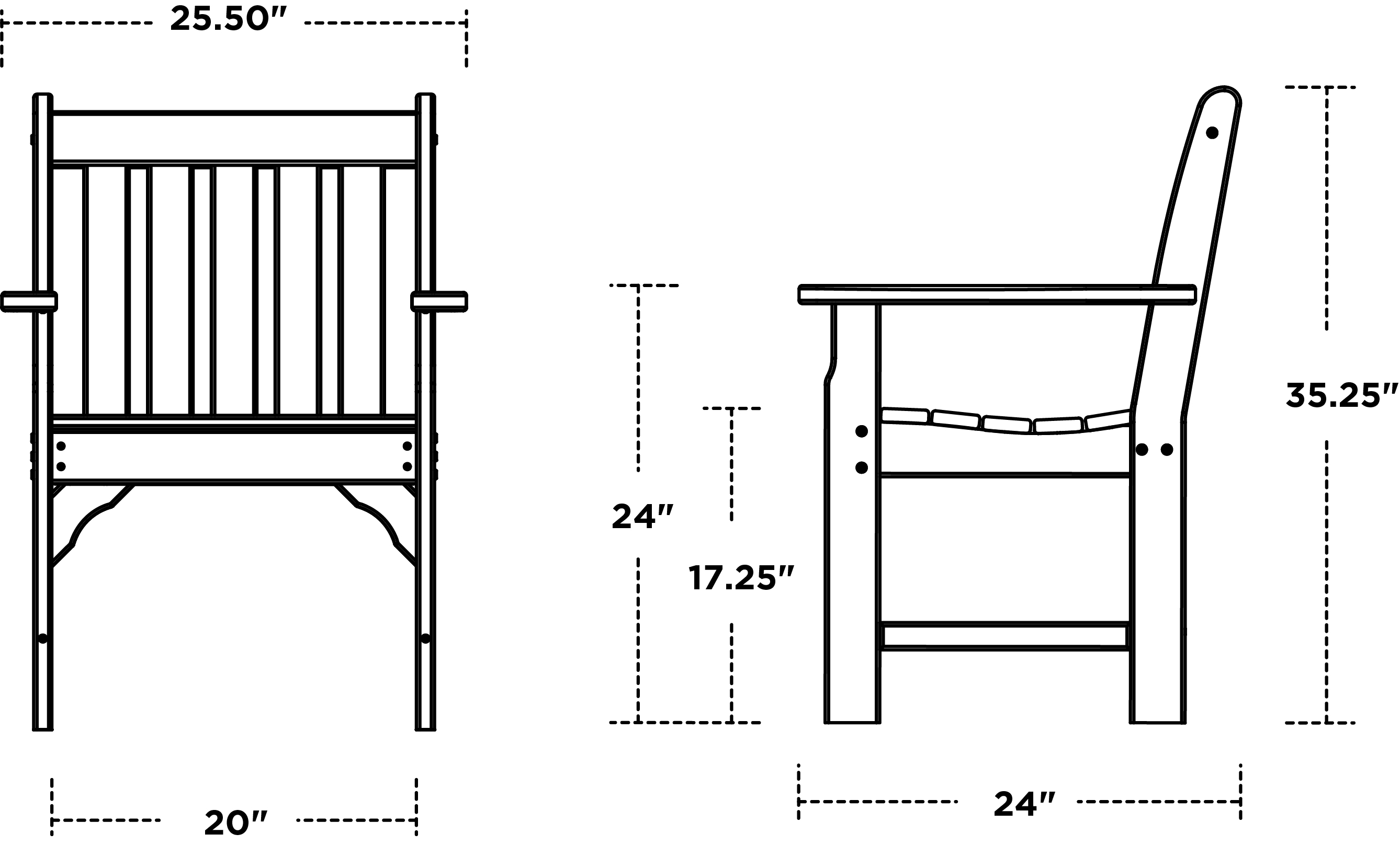This Polywood Vineyard Garden style arm chair is made of recycled plastic that makes for Maintenance free outdoor furniture comfort. Recycled Plastic Polywood Lumber is made from over 90% post consumer plastic and High Density Polyethylene which is impervious to all types of weather conditions including rain, snow, salt water, sun and ice. Polywood has color fastness and UV inhibitors to reduce fading. Polywood never splinters, warps or corrodes and is tougher and more resilient than treated wood.